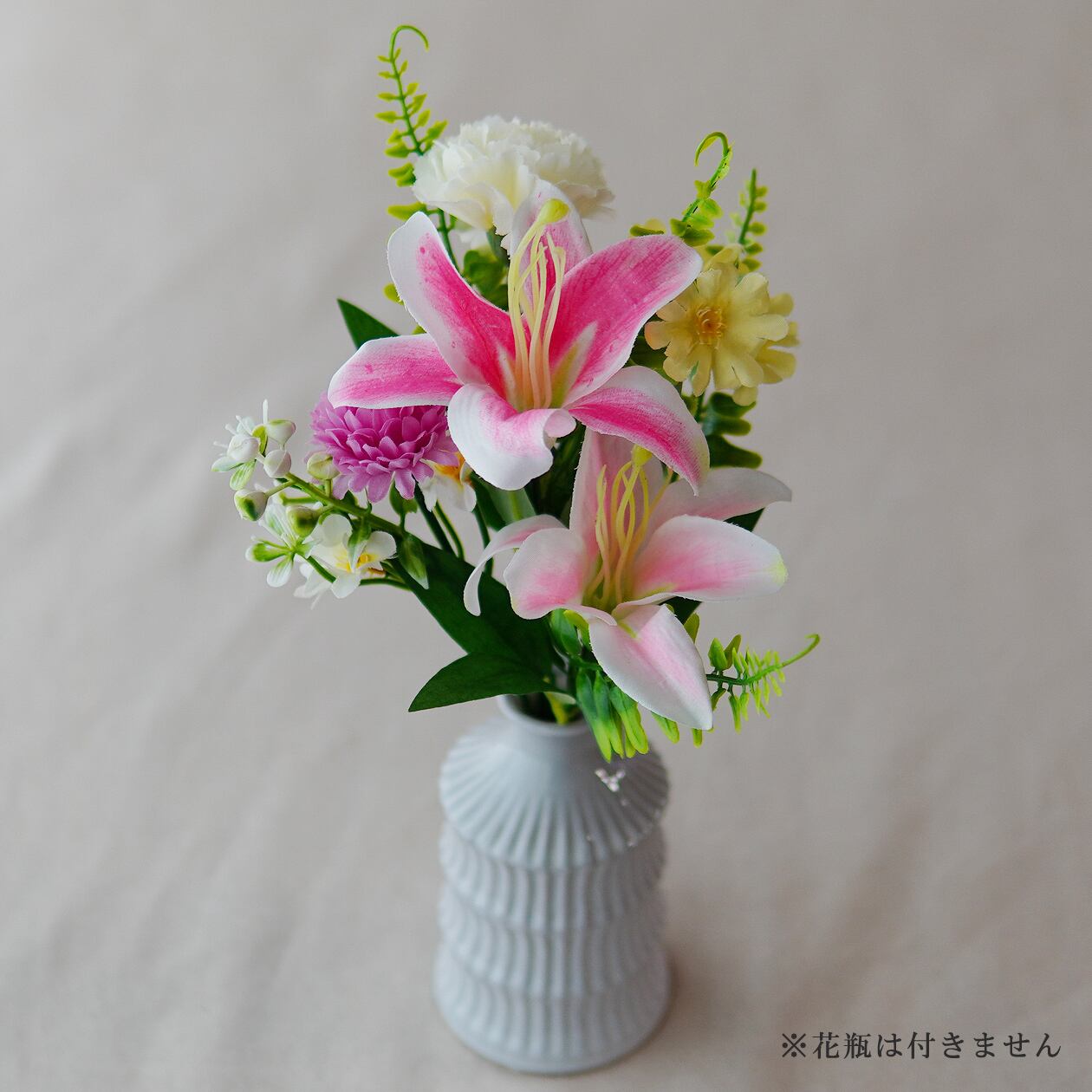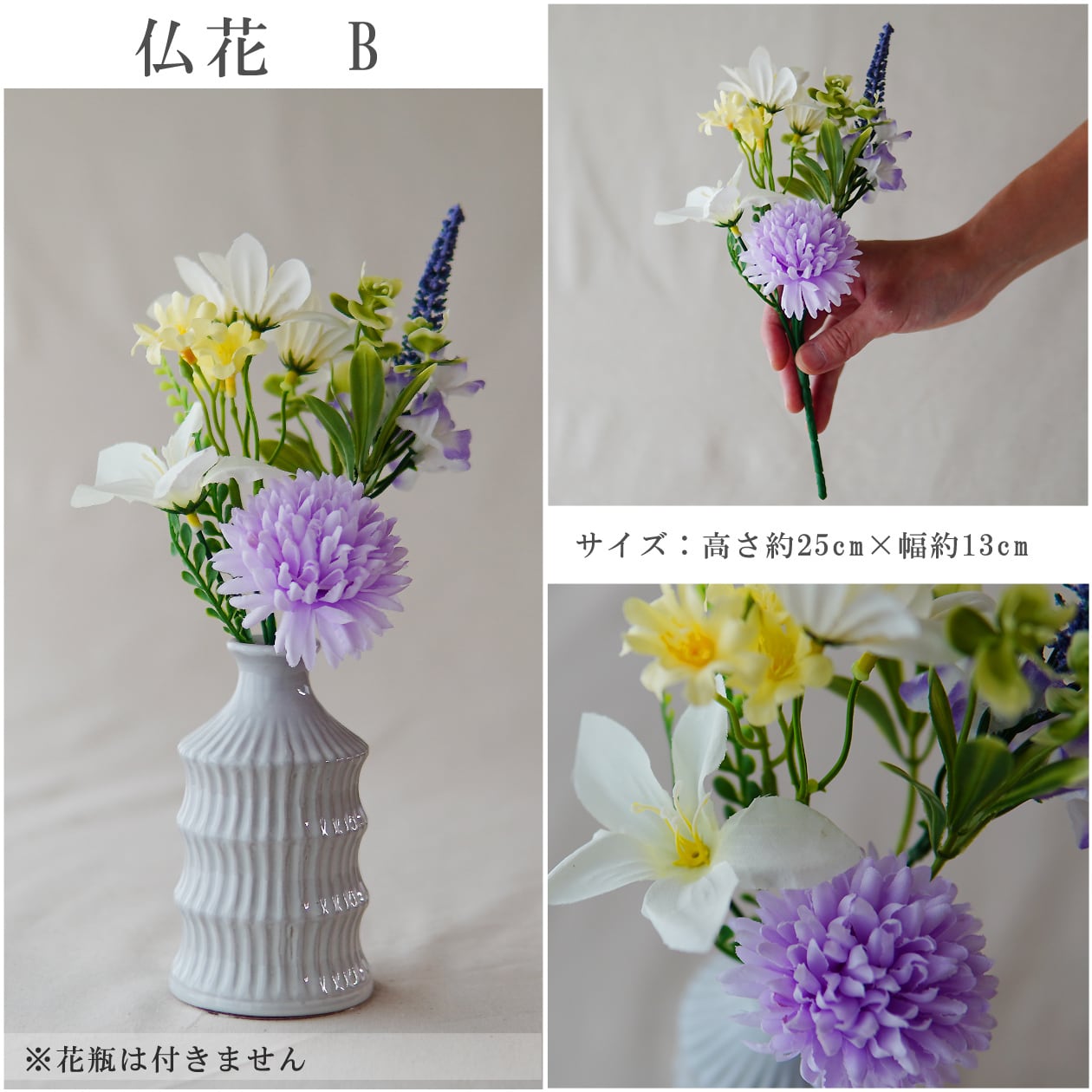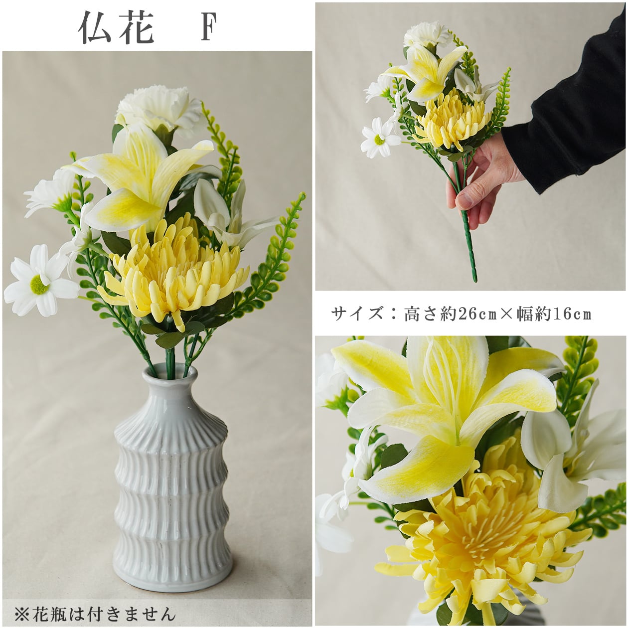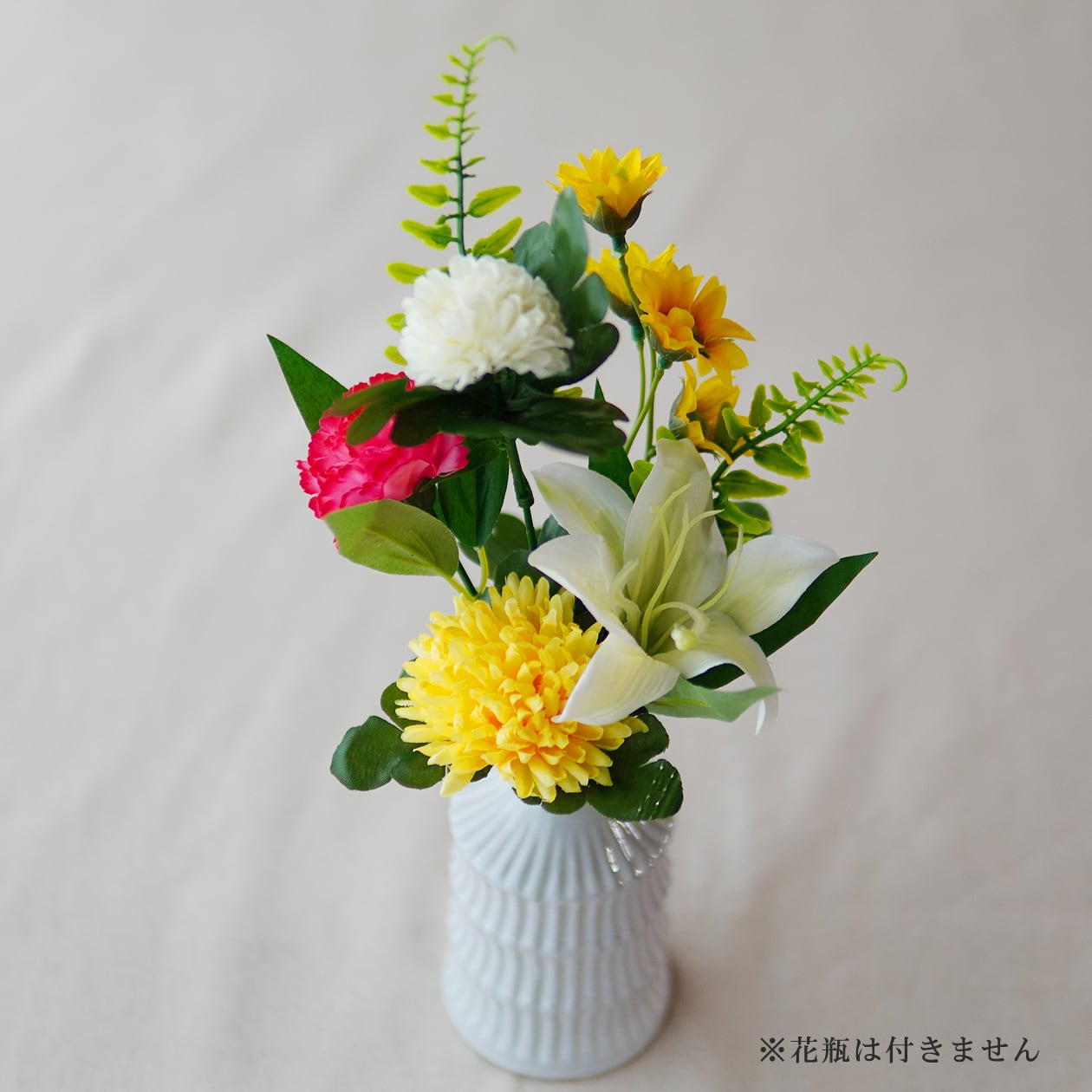 こちらは、仏壇やお墓にお供えできる美しい造花の仏花です。お悔やみやお彼岸の際に、心を込めてご利用いただけます。色とりどりの花々が、故人を偲ぶ気持ちをより一層引き立ててくれます。